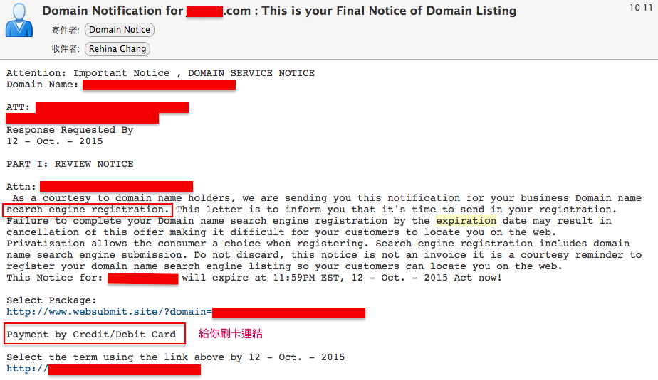製作假的英文通知內容,告知域名到期通知讓您在不知情的情況下繳費。